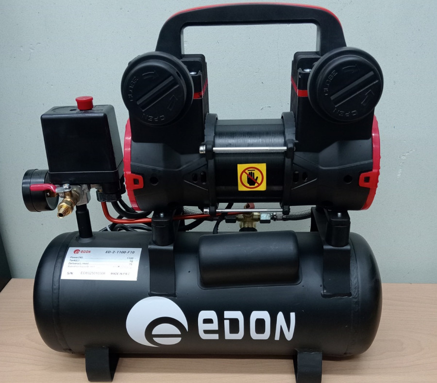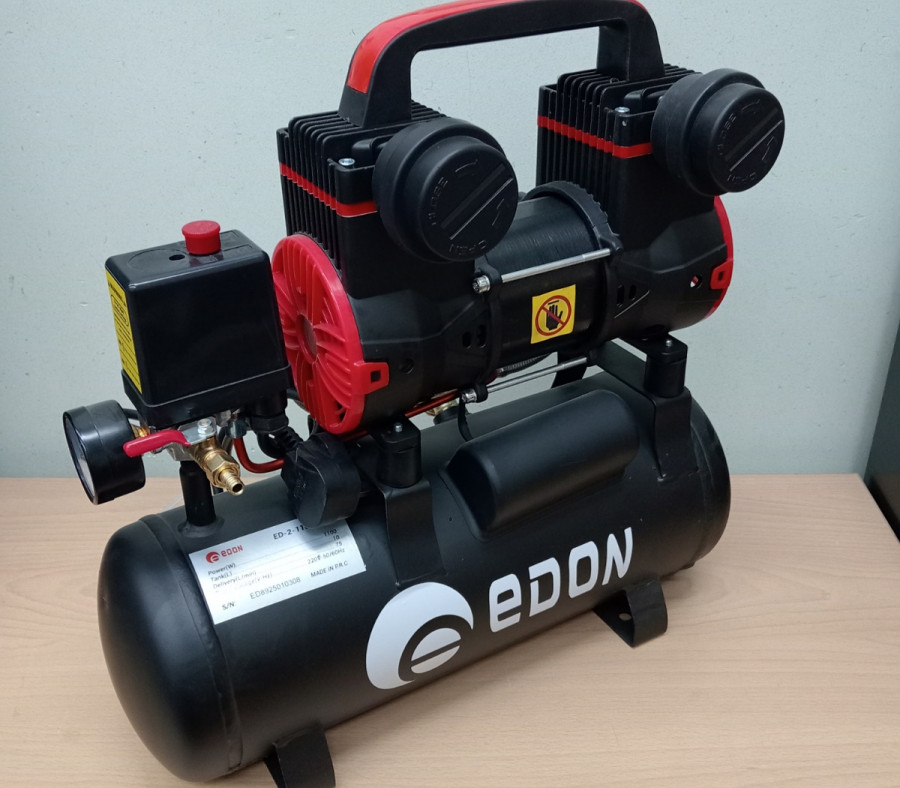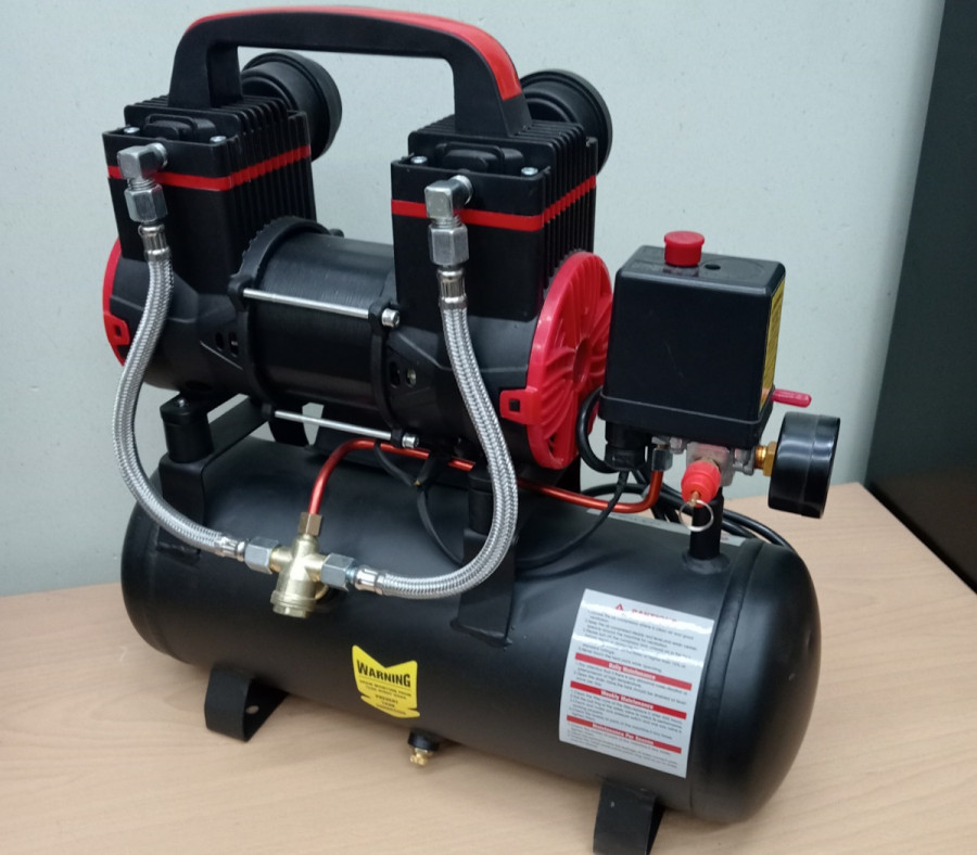 کمپرسور کم صدای ۱۰ لیتری با کمترین صدا و بدون روغن کار می کند و با داشتن مخزن ذخیره باد ، امکان استفاده در کارگاه های کوچک برای مصارف رنگ کاری با ایربراش ، پیستوله یا سایر مصارف صنعتی را فراهم می کند . پمپ دارای شیر تنظیم باد خروجی و درجه نمایش فشار باد می باشد ، بیشینه فشار باد ۱۲بار یا ۱۵۰ پی است آی است . همچنین از یک سوئیچ بادی بهره می برد تا در زمانی مخزن باد پر شد ، پمپ به صورت خودکار خاموش می شود. مخزن دارای پیچ نمی گیر برای تخلیه آب موجود در هوای فشرده می باشد ،